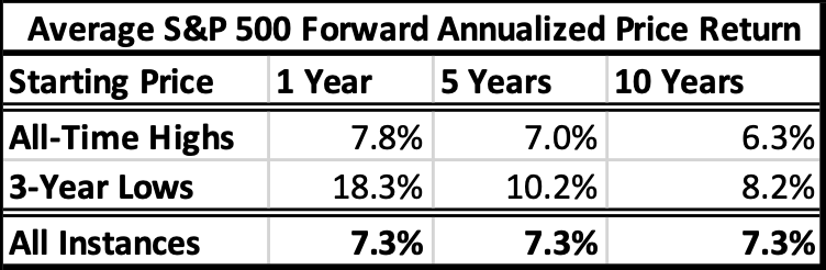 Going back to 1940, the S&P 500 was at an all-time high 20.8% of the time and at a 3-year low 3.4% of the time. The average 1-year forward price return for the S&P 500 was 7.3% overall, 7.8% from all-time highs, and 18.3% from 3-year lows. The average annualized 10-year forward price return for the S&P 500 was 7.3% overall, 6.3% from all-time highs, and 8.2% from 3-year lows.