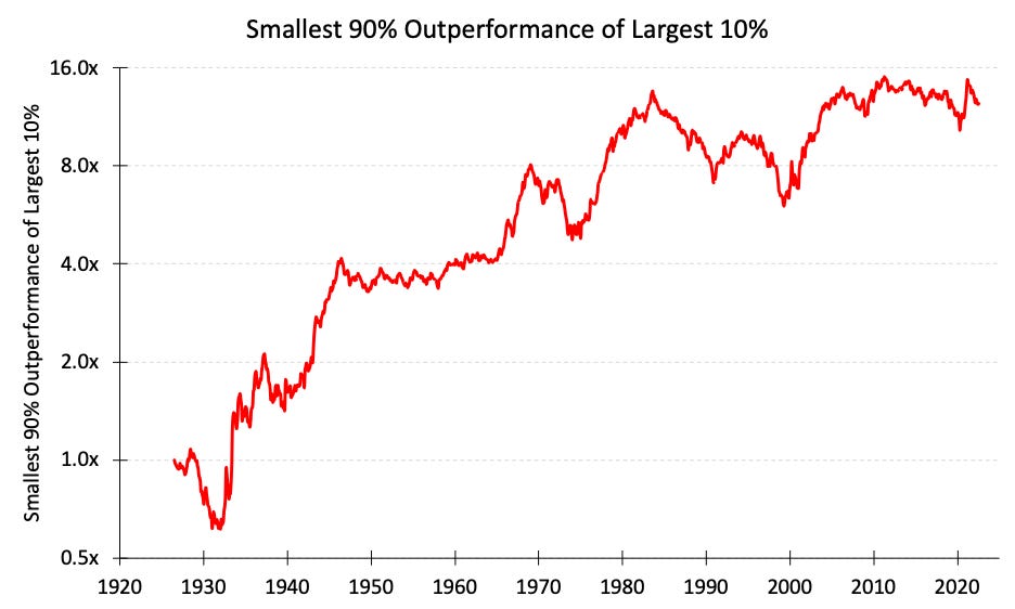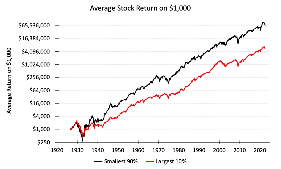 The largest 10% of all U.S. stocks returned 9.4% annually over this period while the smallest 90% of all U.S. stocks returned 12.3% annually, resulting in a 2.9% yearly disadvantage for the largest stocks.