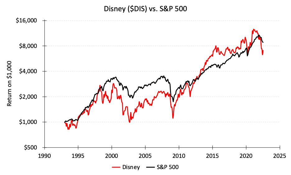 Disney’s countless emotional attachments and its large market capitalization are red flags to me as an investor, however. An approachable stock that attracts so many fundamentals-indiscriminate investors is a stock that is likely over-priced. Would you believe me if I told you that Disney’s stock has underperformed the S&P 500 since 1993?