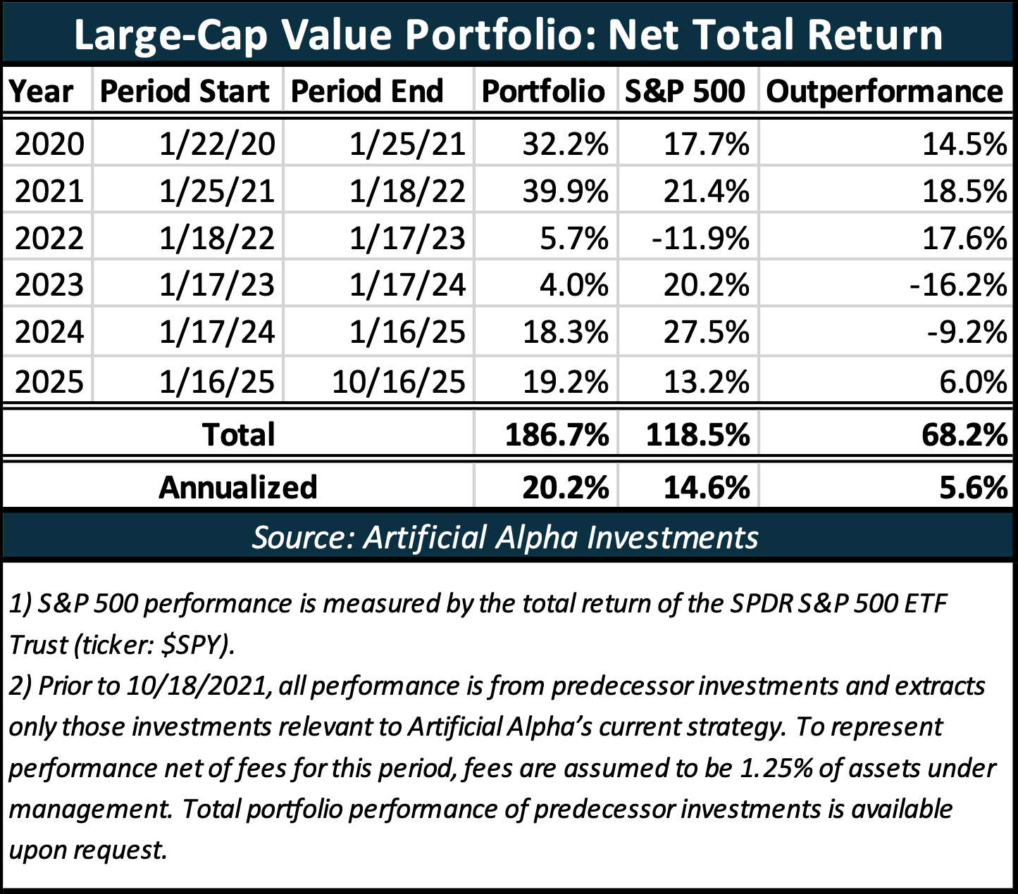 Artificial Alpha Investments has provided clients with active portfolio management to address these ETF shortcomings since October 18, 2021. Its flagship portfolio, designed for outperformance, has been continuously traded since January 22, 2020.
