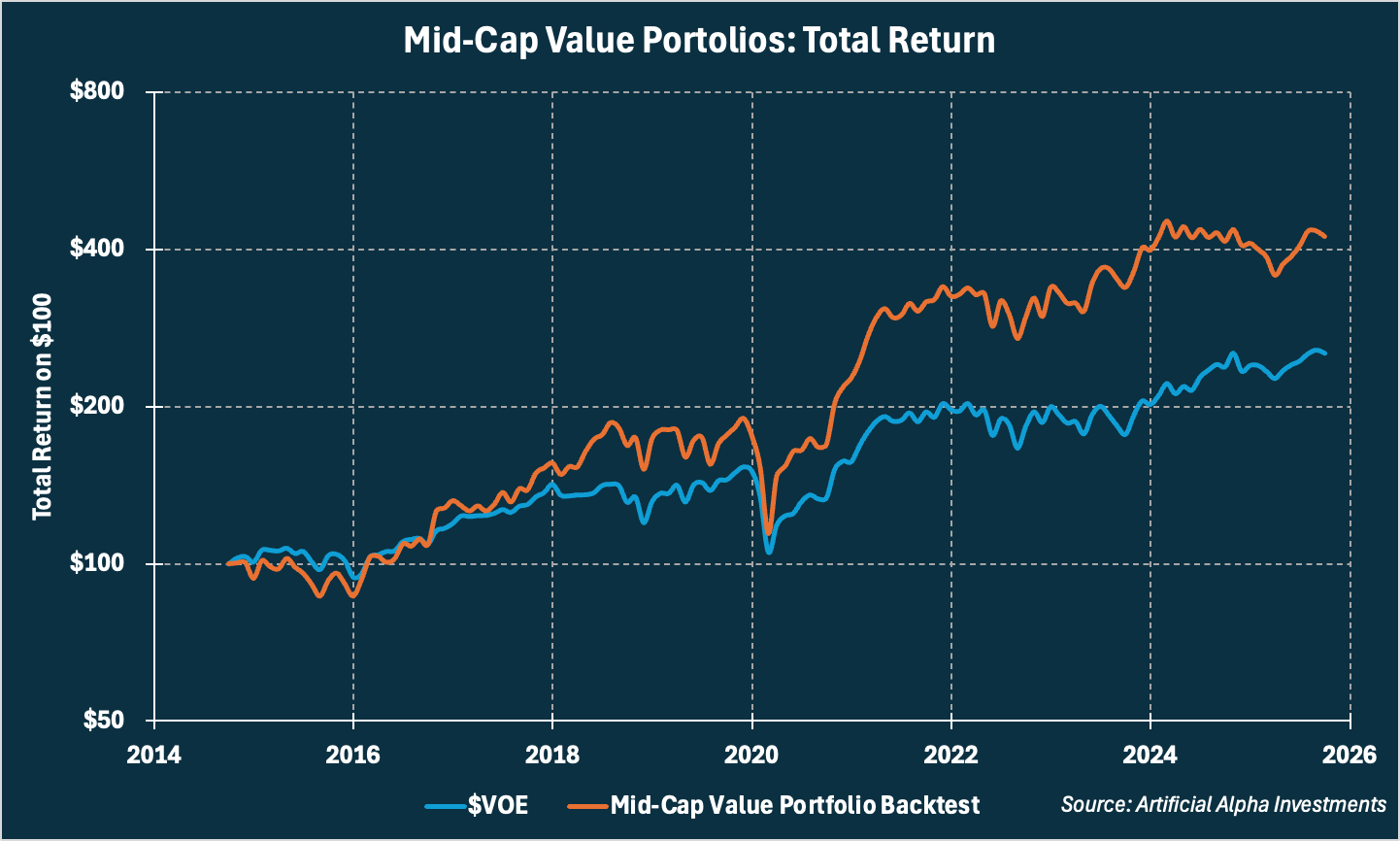 Sure enough, the backtested portfolio would have had a 14.0% total return per year since 2015, vs. 8.8% for the $VOE ETF.