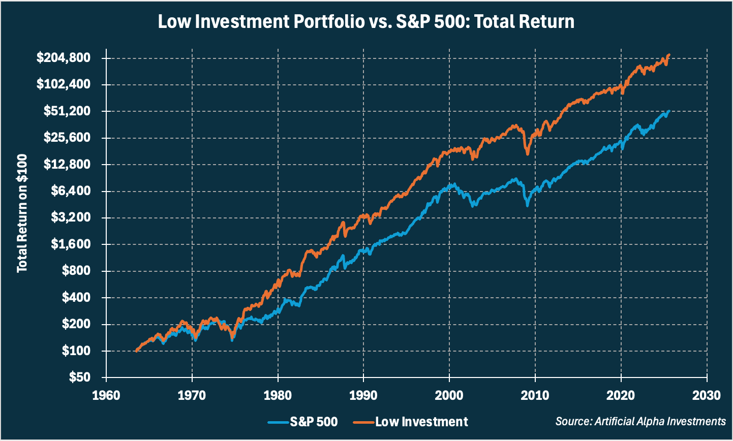 One factor identified by Fama-French is asset growth, or what Fama-French refer to as the Investment factor. The lowest 20% of companies by asset growth have had a 13.2% total return per year since 1963, vs. 10.6% for the S&P 500.