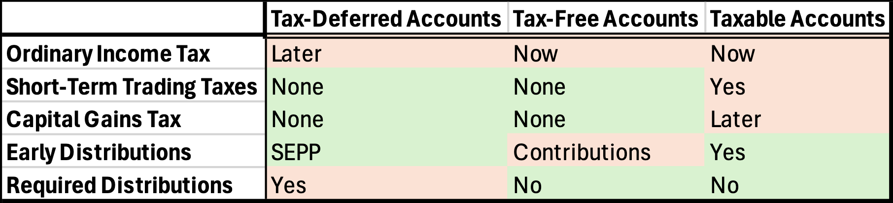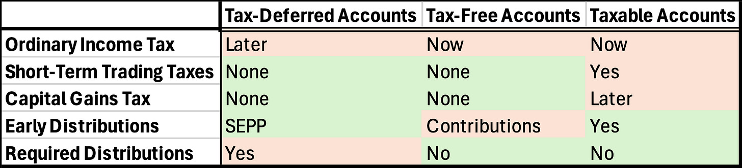 I especially wanted to write this letter because SEPP plans (or Roth Conversion Ladders) are not widely utilized. It is exceedingly popular to forgo Tax-Deferred Accounts entirely, but I think that is a mistake if early distributions are even remotely in the cards. Tax-Deferred Accounts are the only ones that combine tax savings and considerable early distributions.