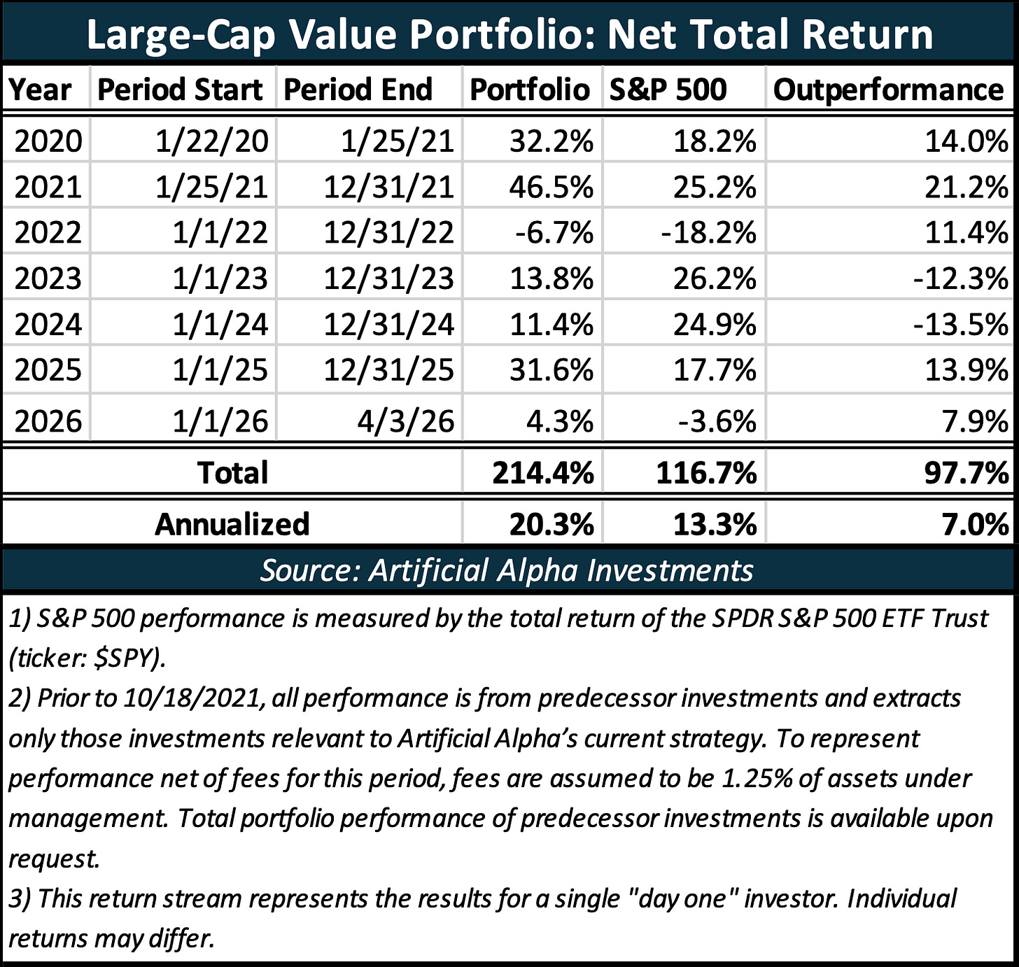This portfolio has been traded for clients since January, 2020. Artificial Alpha’s Large-Cap Value Portfolio is primarily built to outperform the S&P 500 (after fees).