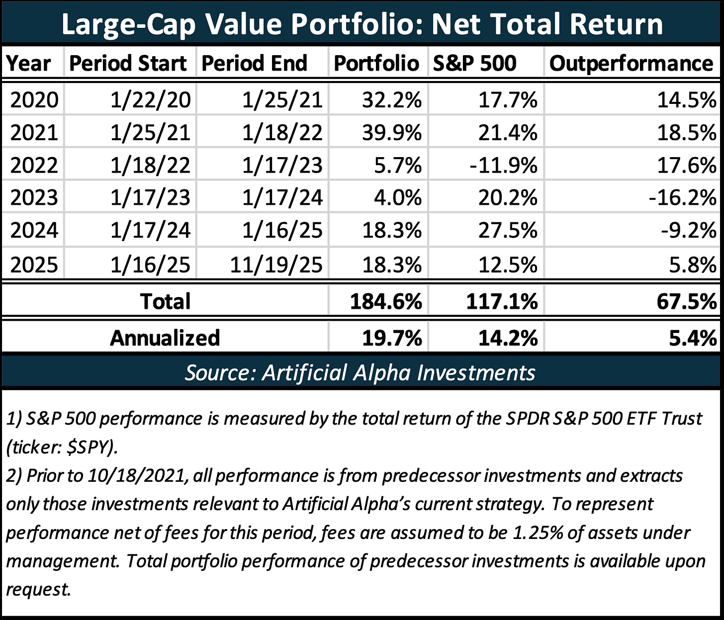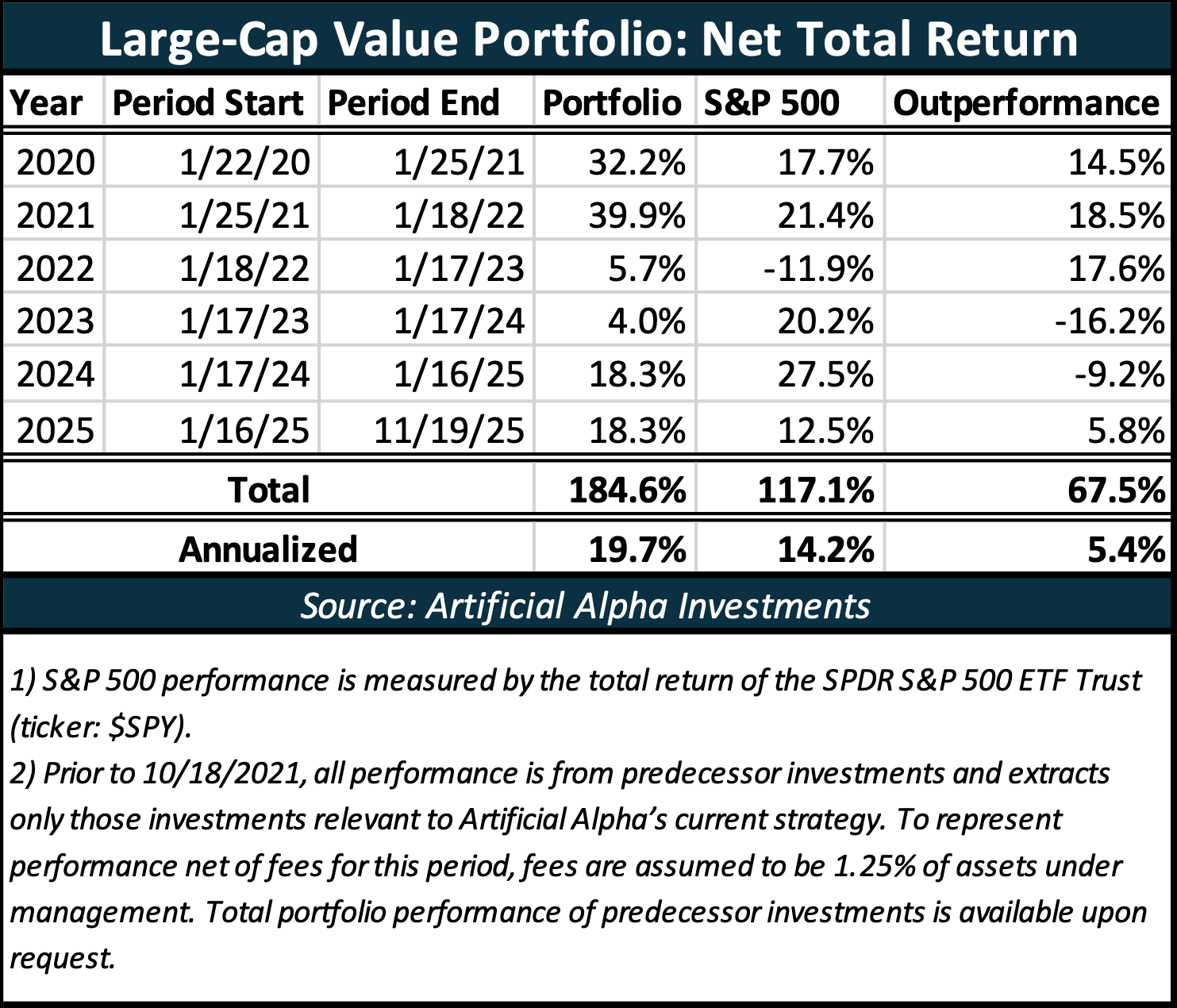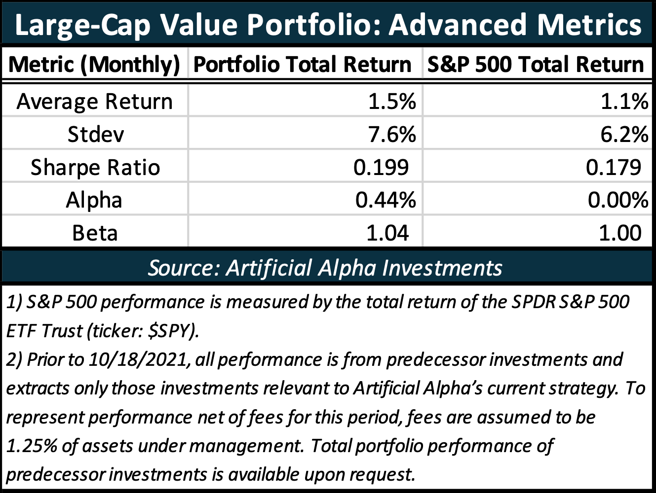 Artificial Alpha’s Large-Cap Value Portfolio is built to outperform the S&P 500 (after fees).