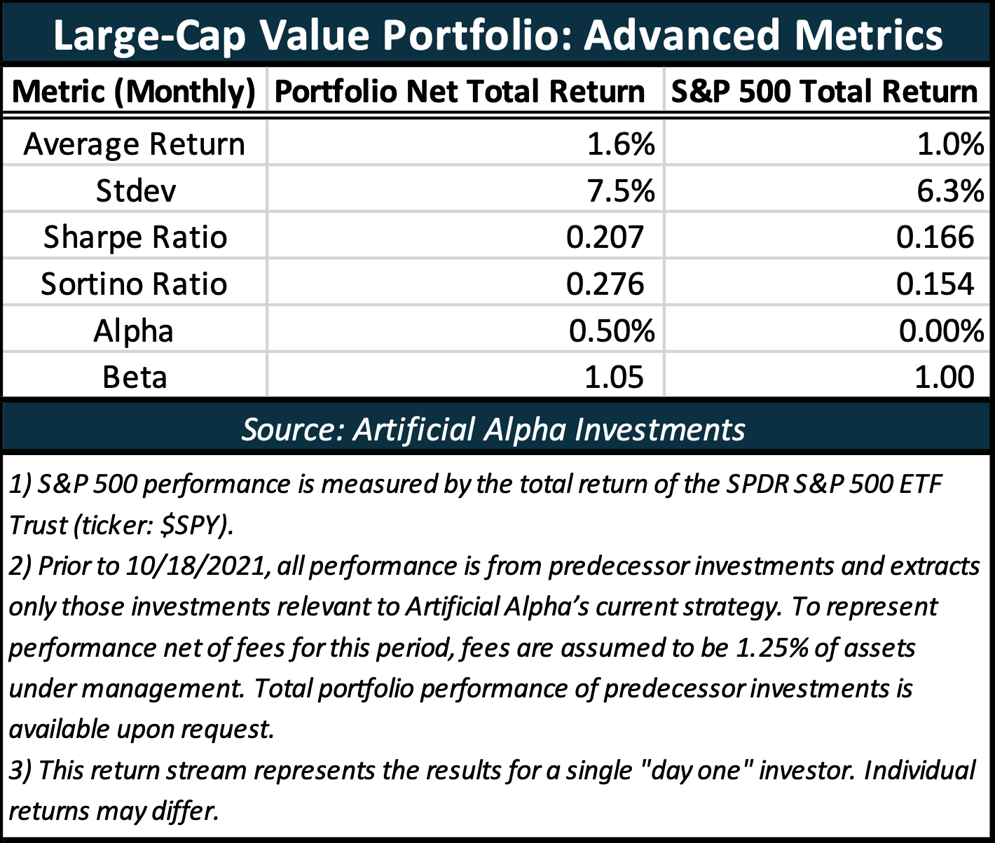 Artificial Alpha’s Large-Cap Value Portfolio is not built to lower volatility, but it is still designed for better risk-adjusted performance than the S&P 500 (after fees)