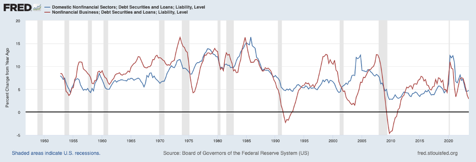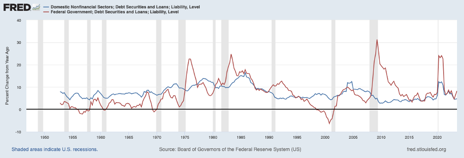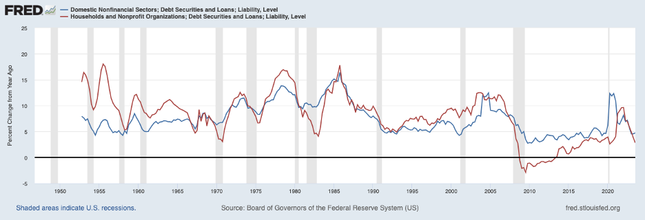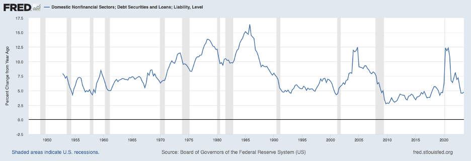 The supply of money has increased by about 7% per year since our modern monetary system was created in the mid 1900s. There are many ways of measuring money supply, but my preferred accounting method takes all nonfinancial debts in our economy.