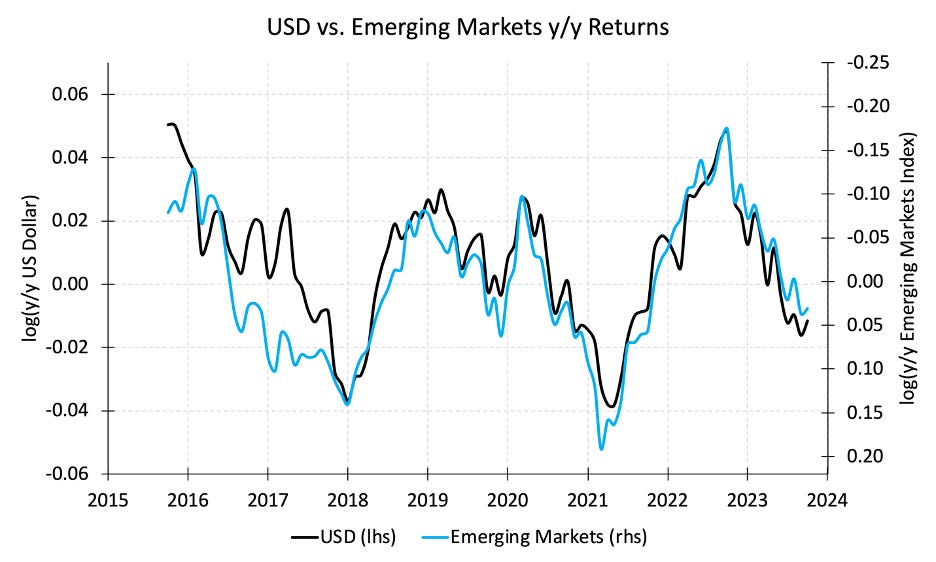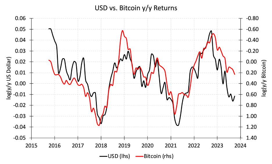 I am sympathetic to the idea that Bitcoin fulfills some financial purpose that justifies demand. After all, there aren’t many assets in the world with a theoretically fixed supply. That said, the best fundamental relationship I can find is an inverse relationship to the US Dollar.