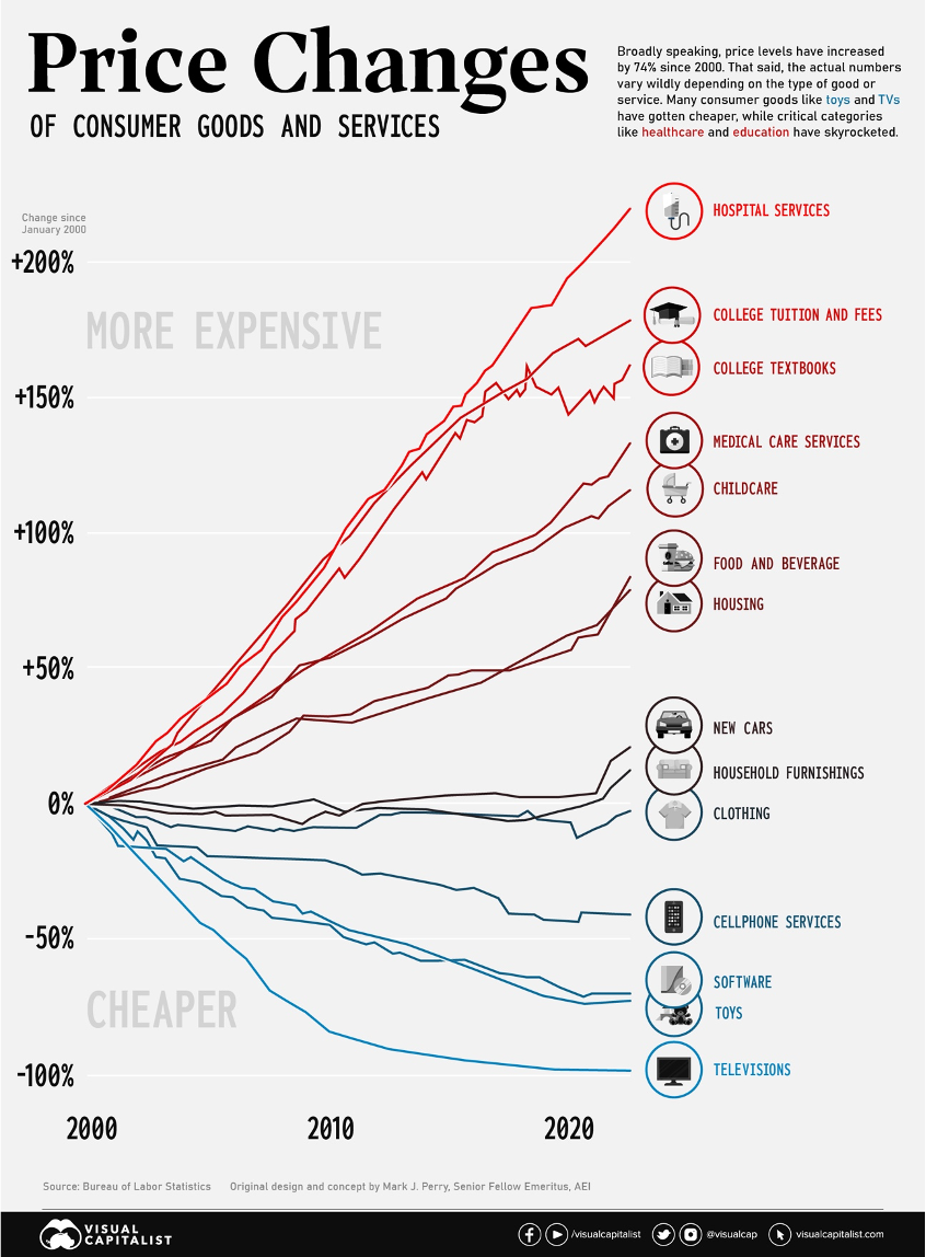 Not all goods are created equal, however. Some have gotten easy to produce and some have made no efficiency gains. This is a bit of a simplification, but one doctor still treats one patient and so supply has barely budged. You guessed it, hospital services have increased by about 7% per year since the mid 1900s! On the other hand, televisions have become insanely easy to produce and prices have dropped!