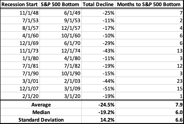 Let’s consider the month of every recession since WW2 and the month that the S&P 500 bottomed. The median recession in our sample sent the S&P 500 19.2% lower within 6 months of the recession’s beginning.