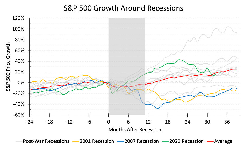 I’ve highlighted the 2001 and 2007 recessions in the chart above because they represent the biases we’ve picked up during recent recessions. These S&P 500 declines were elongated and brutal but do not nearly represent the average. Aggressive, young, long-term investors should avoid overweighting these probabilities in their investment decisions.
