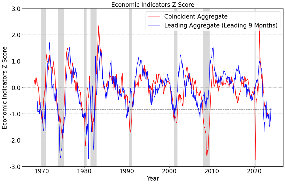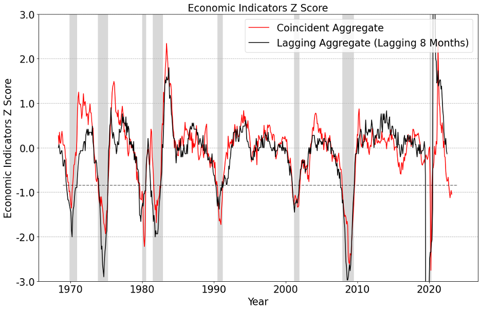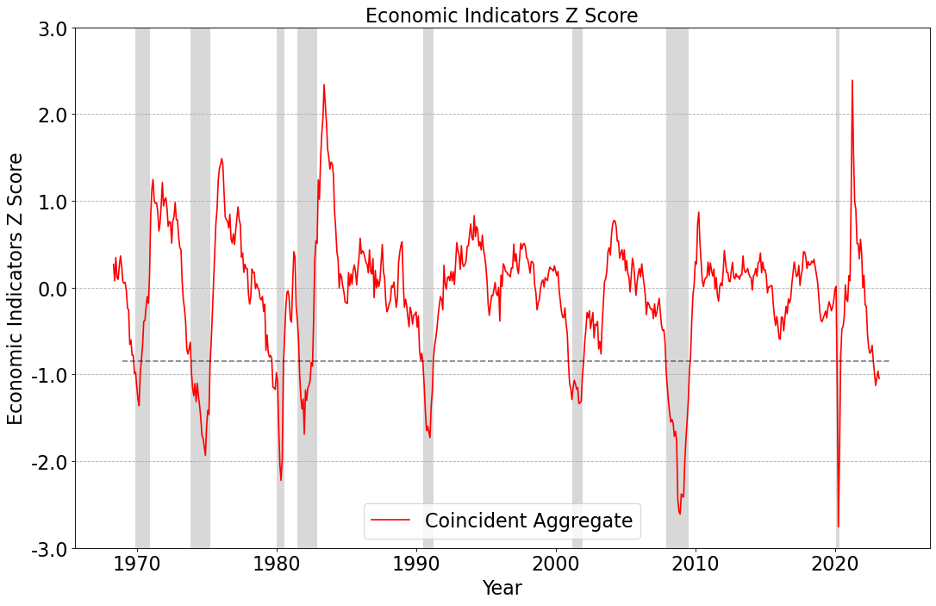 We (NBER, actually) tend to date the start of a recession when coincident economic data experience a -0.85 standard deviation move lower. This time around, my coincident index crossed below -0.85 in November 2022 and coincident data continued to get worse in Q1 2023.