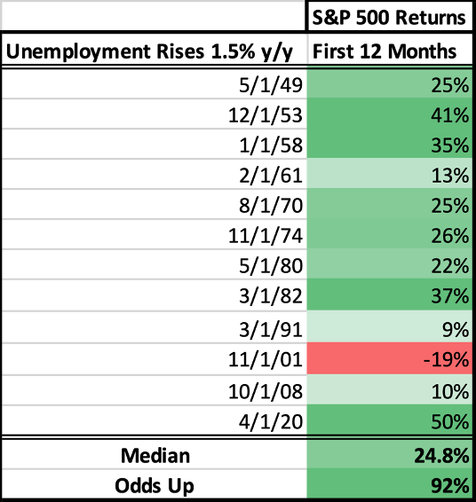Buying with the lagging economic indicators is intriguing to me though. Let’s take a closer look at one lagging economic indicator, the Unemployment Rate. Unemployment data tend to confirm a recessionary cycle. Let’s look at stock market returns after the Unemployment Rate rose 1.5% from the year prior.